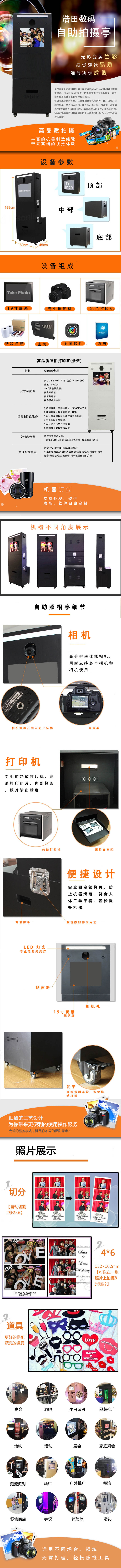 產品特點:參加過國外活動和婚禮的朋友應該對photo booth移動照相棚這個概念一點都不陌生。Photo booth使專業的攝影變得沒有那么單調,讓大家在拿著各種道具自拍中找到嗨點。簡單美觀輕便的外形,與整體的婚禮氛圍融為一體。只要輕輕觸摸屏幕,就可以三連拍,四連拍,五連拍,六連拍。連拍的照片8秒后就可以打印成功。