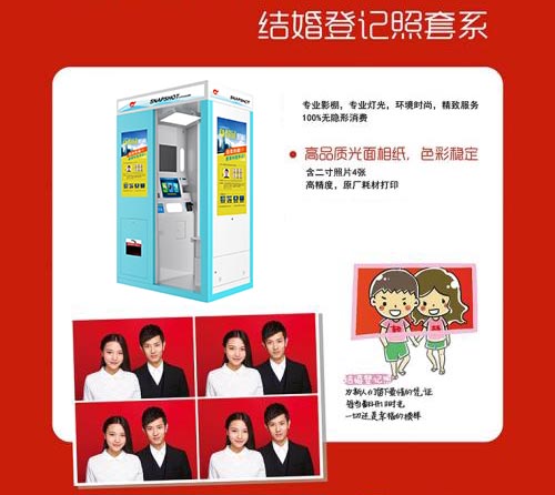 上海自助證件照機器滿足的婚紗、寫真、婚宴、商場等等市場,結婚證自助證件照機器系統(tǒng),專業(yè)影棚,能滿足兩人拍攝結婚照,專業(yè)的燈光,環(huán)境時尚,精致服務。