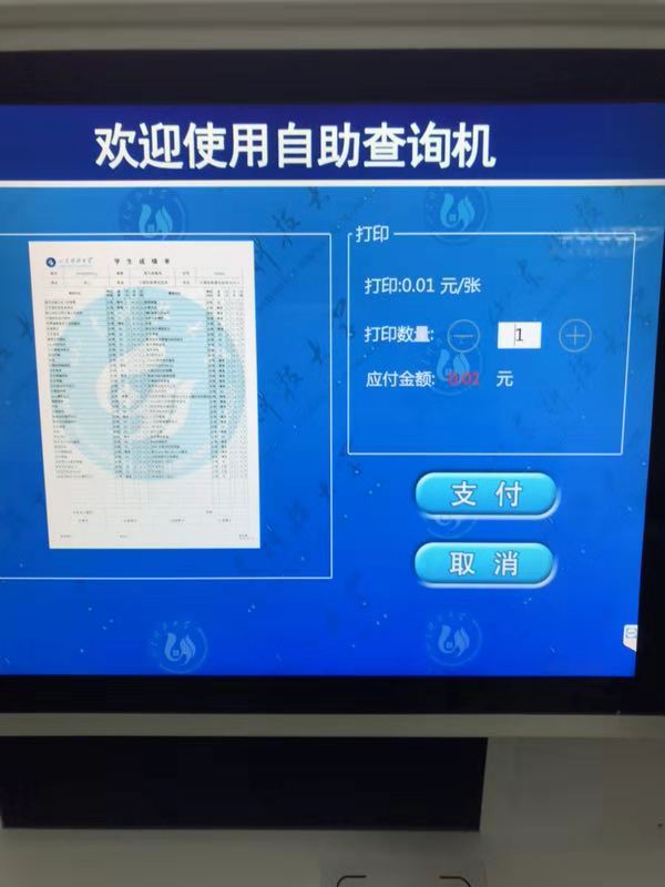 該校園自助打印一體機系統是具有自主知識產權的、面向高校的信息化設備,基于觸控屏的操作方式,具有安全穩定、操作簡便的特點,是助力高校信息化建設的又一新興設備。該系統主要用于學生中英文成績單、在讀證明、學籍證明、個人信息等多種信息的查詢與自助打印,并附帶我校紅色電子印章,具有證明和防偽功能。這意味著,通過自助打印設備打印的成績單及各種證明不用再去教務處蓋章,極大地提高了效率。